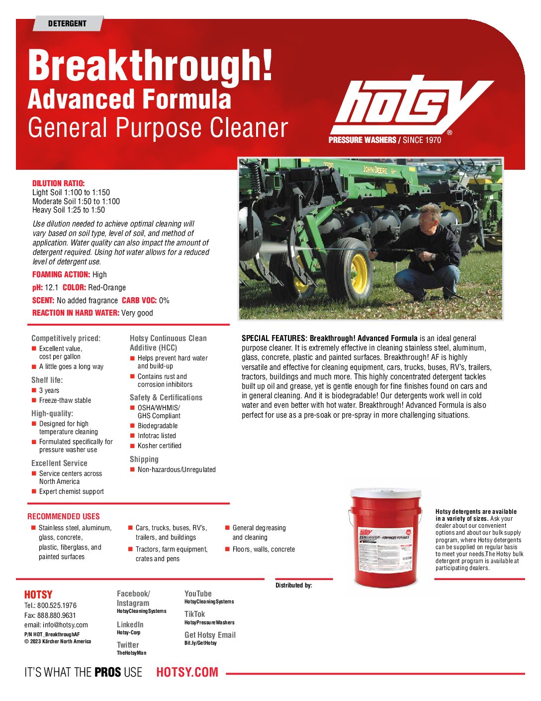 Breakthrough! Advanced Formula is an ideal general purpose cleaner. Extremely effective in cleaning stainless steel, aluminum, glass, concrete, plastic and painted surfaces. Highly versatile and effective for cleaning equipment, cars, trucks, buses, RV’s, trailers, tractors, buildings and much more. This highly concentrated detergent tackles built up oil and grease yet is gentle enough for fine finishes found on cars and in general cleaning. Works well in cold water and even better in with hot water. Breakthrough! Advanced Formula is also perfect for use as a pre-soak or pre-spray in more challenging situations.